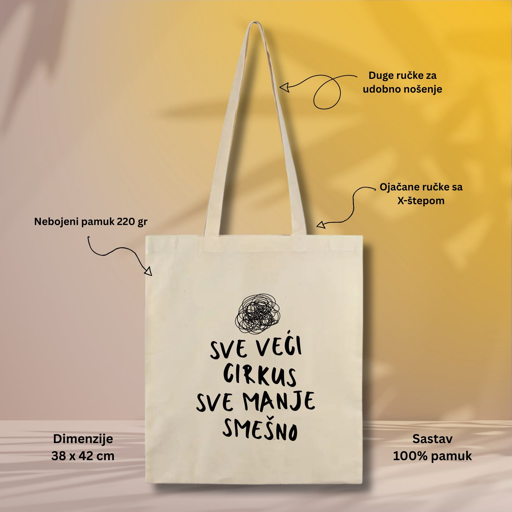 Ovo je onaj ceger koji nosiš svuda — jer izgleda dobro, lako se uklapa uz svaki outfit i može da izdrži mnogo više nego što očekuješ. Napravljen je od 100% nebojenog pamuka gramature 220 g, što znači da je deblji, čvršći i spreman za svakodnevnu upotrebu.